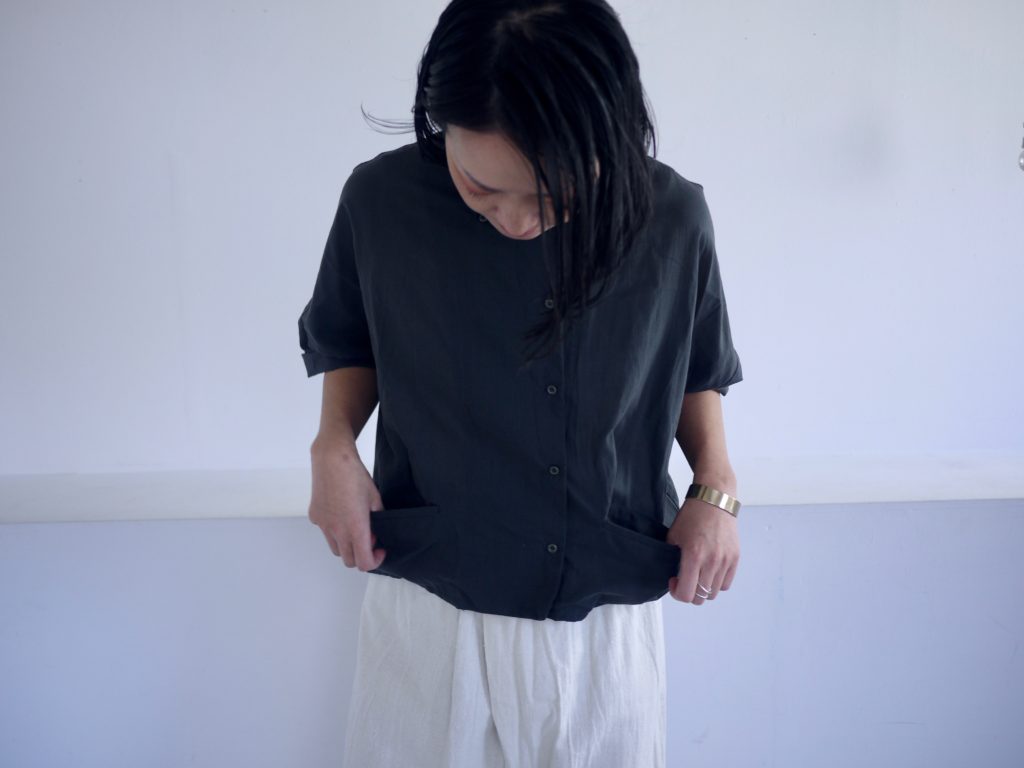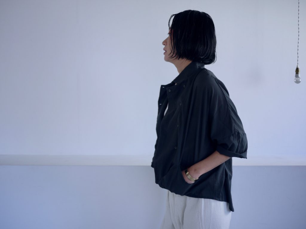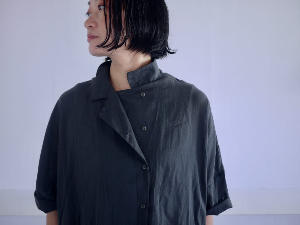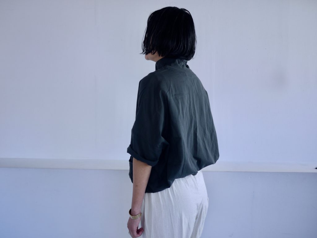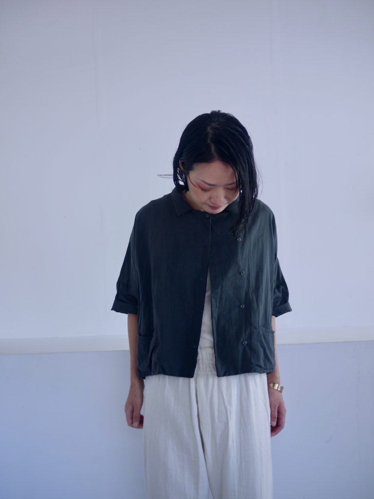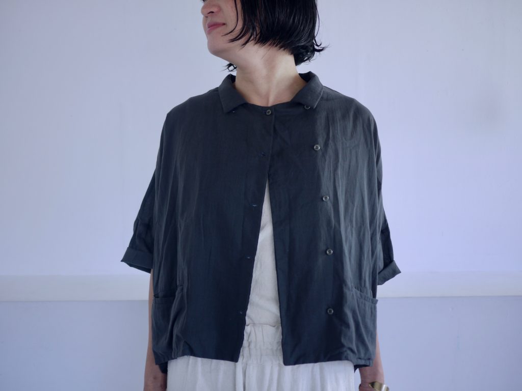 ボタンはダブルシングルというこれも遊びの多い合わせにしています。ボタンの掛け方をずらして軽く羽織るのも良いし、全て留めてシャツ感を出しても良し。パンツスタイルにももちろん、ワンピースやスカートの重ね着として便利です。えりは立てても、たたんで小さめなえりにもできます。
