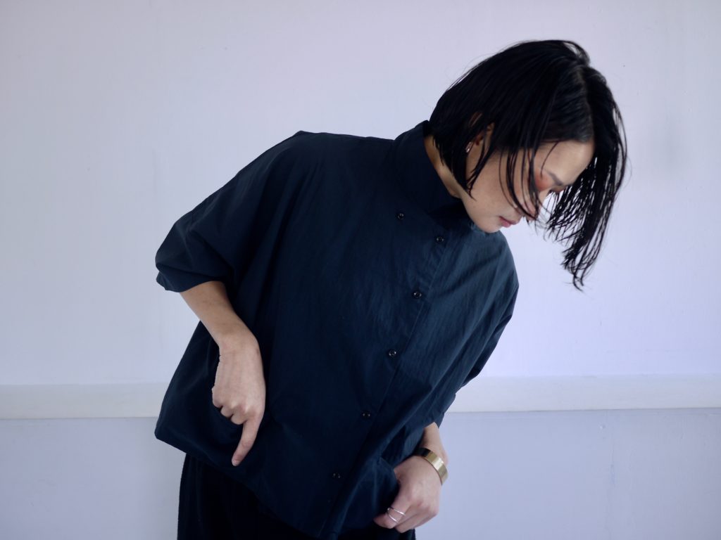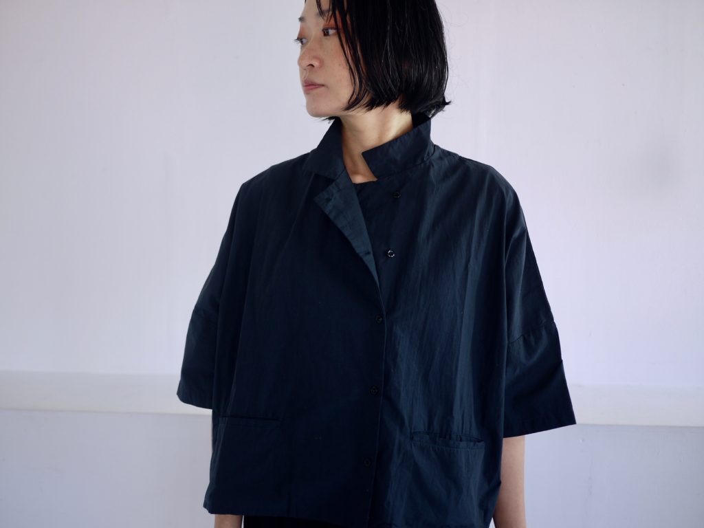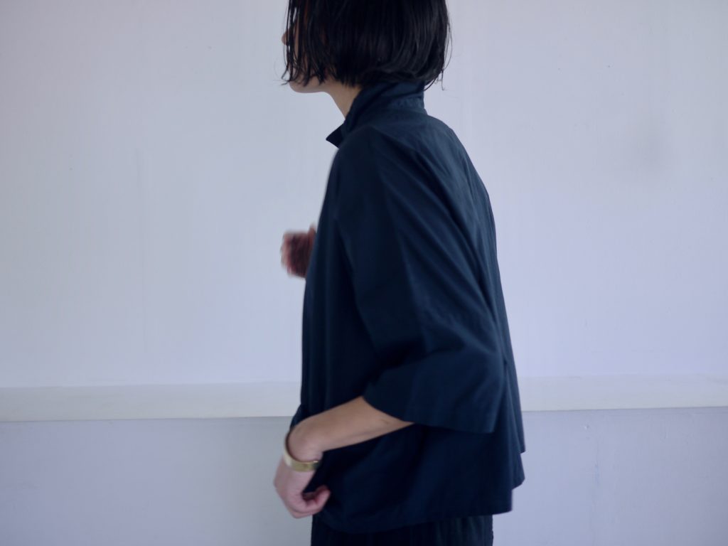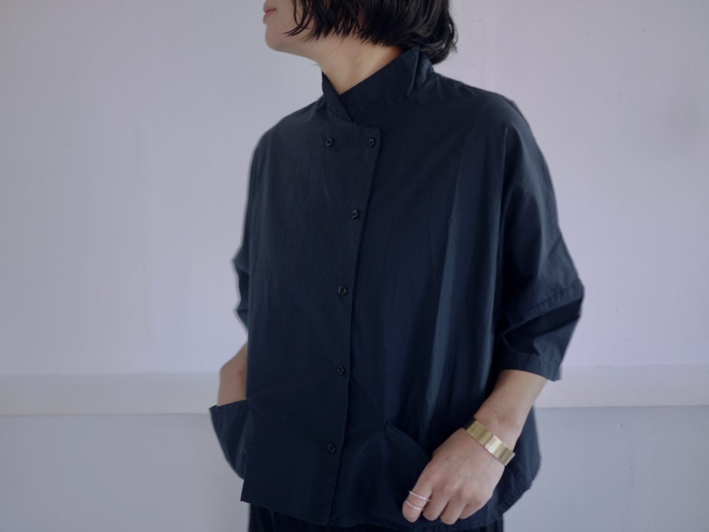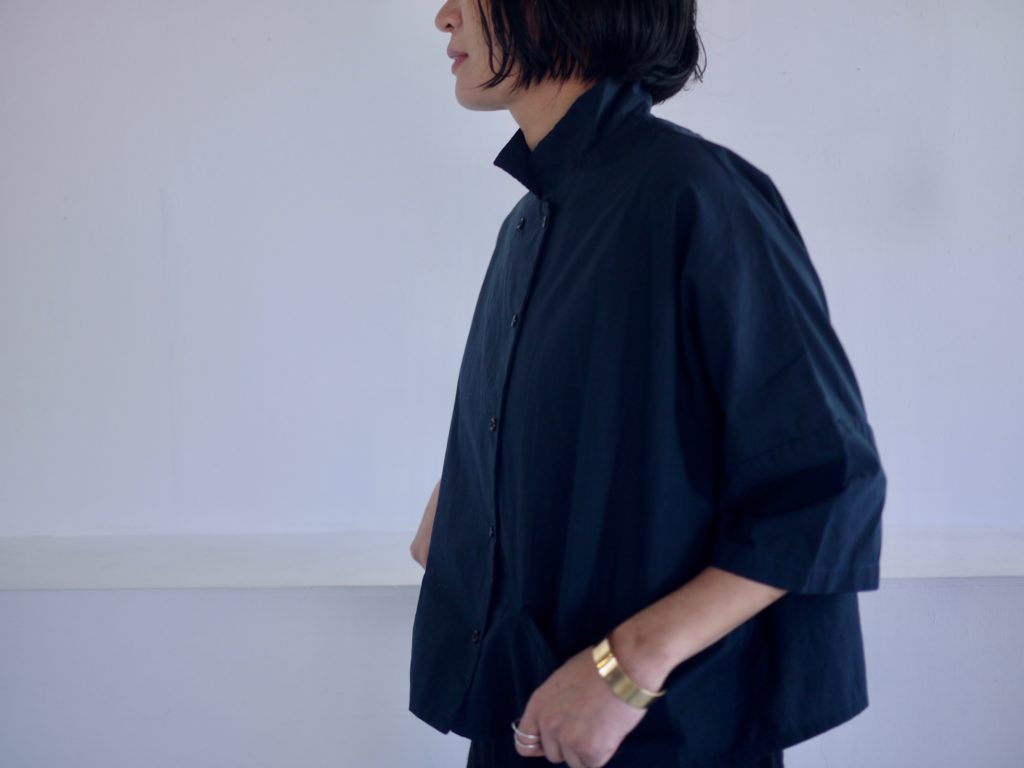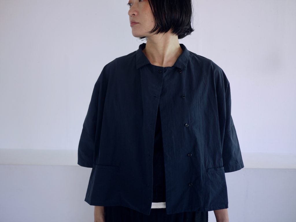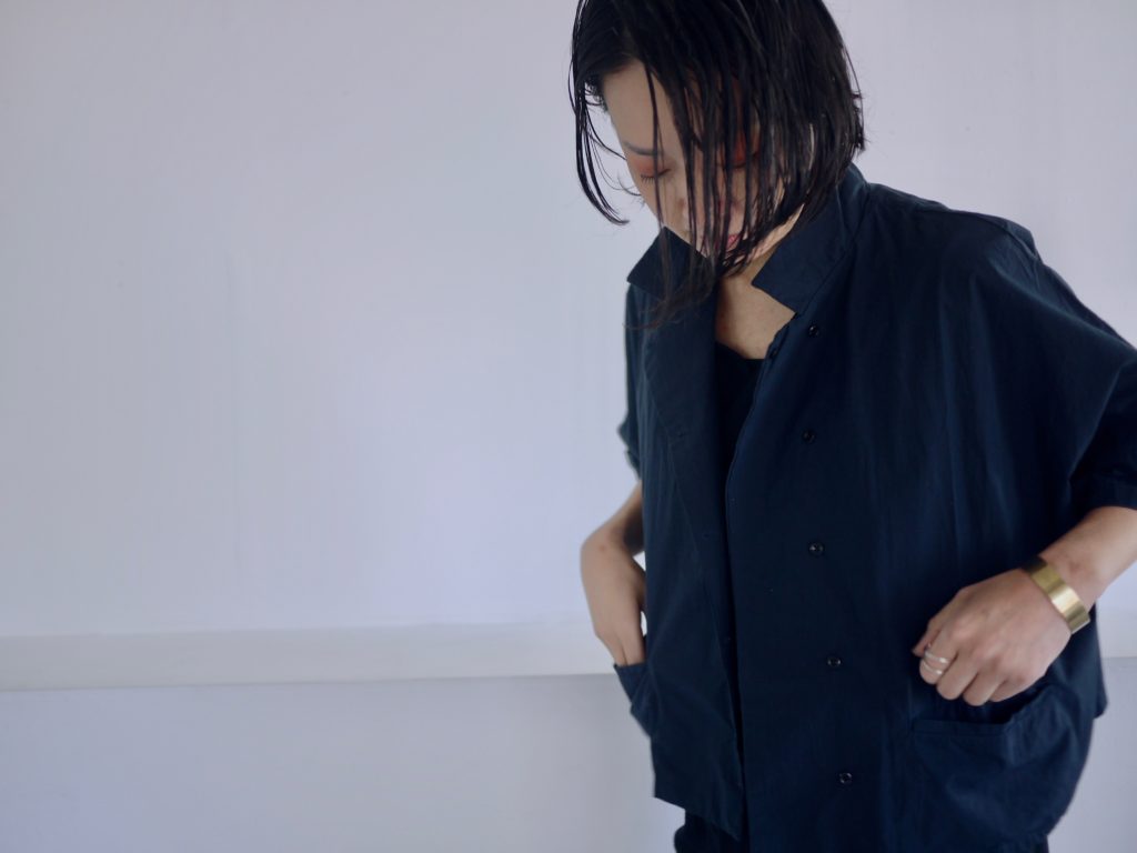 ボタンはダブルシングルというこれも遊びの多い合わせにしています。ボタンの掛け方をずらして軽く羽織るのも良いし、全て留めてシャツ感を出しても良し。パンツスタイルにももちろん、ワンピースやスカートの重ね着として便利です。えりは立てても、たたんで小さめなえりにもできます。