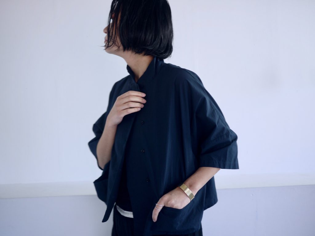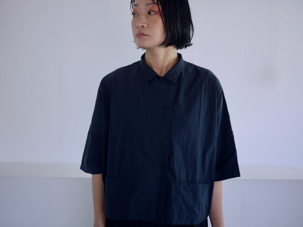 夏に一枚でシャツにも重ねてジャケットのようにも着回せるジャケットシャツ。素材はコットンで張りのあるタイプライターコットンを使用。色は2色。グレイッシュなアイボリーと深いネイビー。