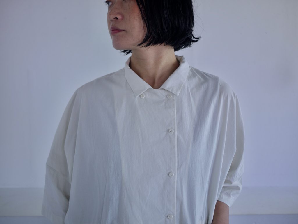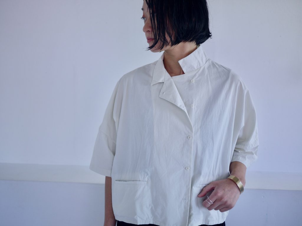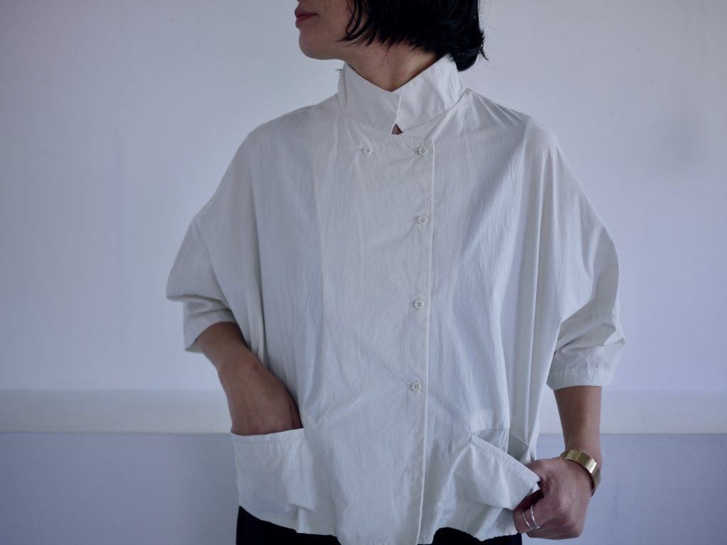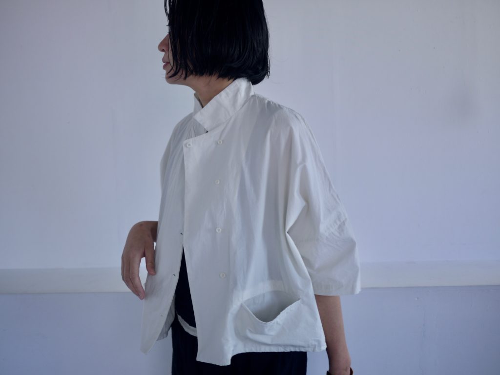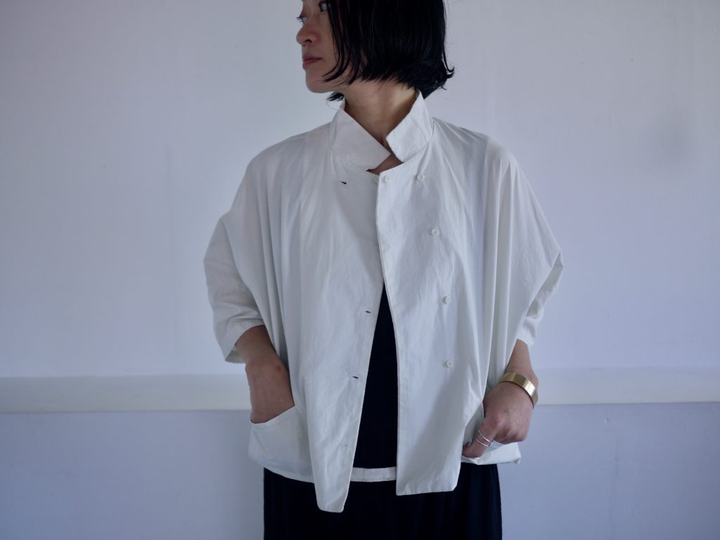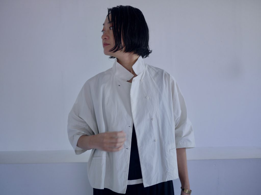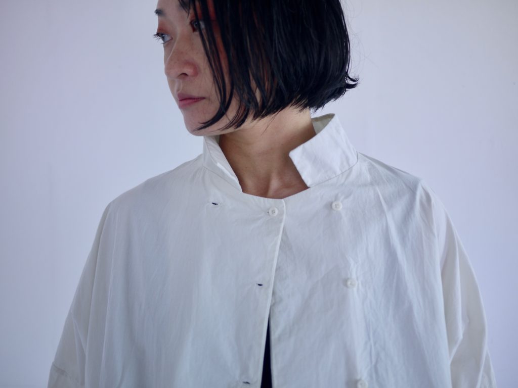 ボタンはダブルシングルというこれも遊びの多い合わせにしています。ボタンの掛け方をずらして軽く羽織るのも良いし、全て留めてシャツ感を出しても良し。パンツスタイルにももちろん、ワンピースやスカートの重ね着として便利です。えりは立てても、たたんで小さめなえりにもできます。