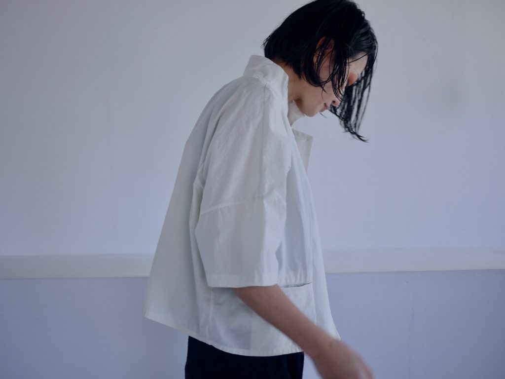 夏に一枚でシャツにも重ねてジャケットのようにも着回せるジャケットシャツ。素材はコットンで張りのあるタイプライターコットンを使用。色は2色。グレイッシュなアイボリーと深いネイビー。