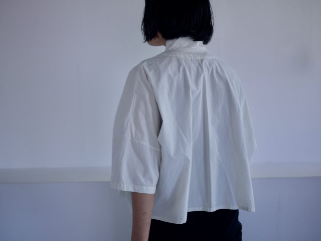 jacket shirtA/Bの大きな違いは後ろのカッティング。AはラウンドBはストレート。Bはそのラインと素材からもよりジャケット感があります。こちらは男性にも着ていただきたい。