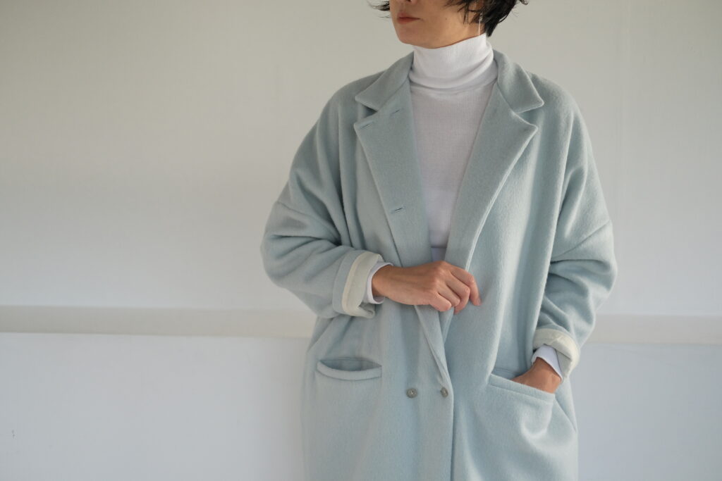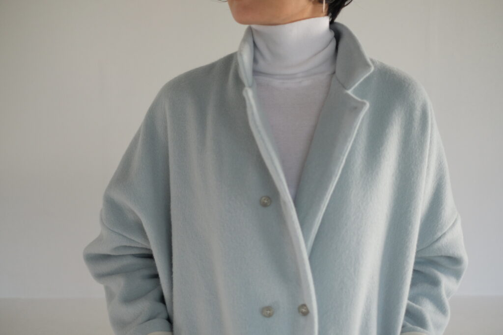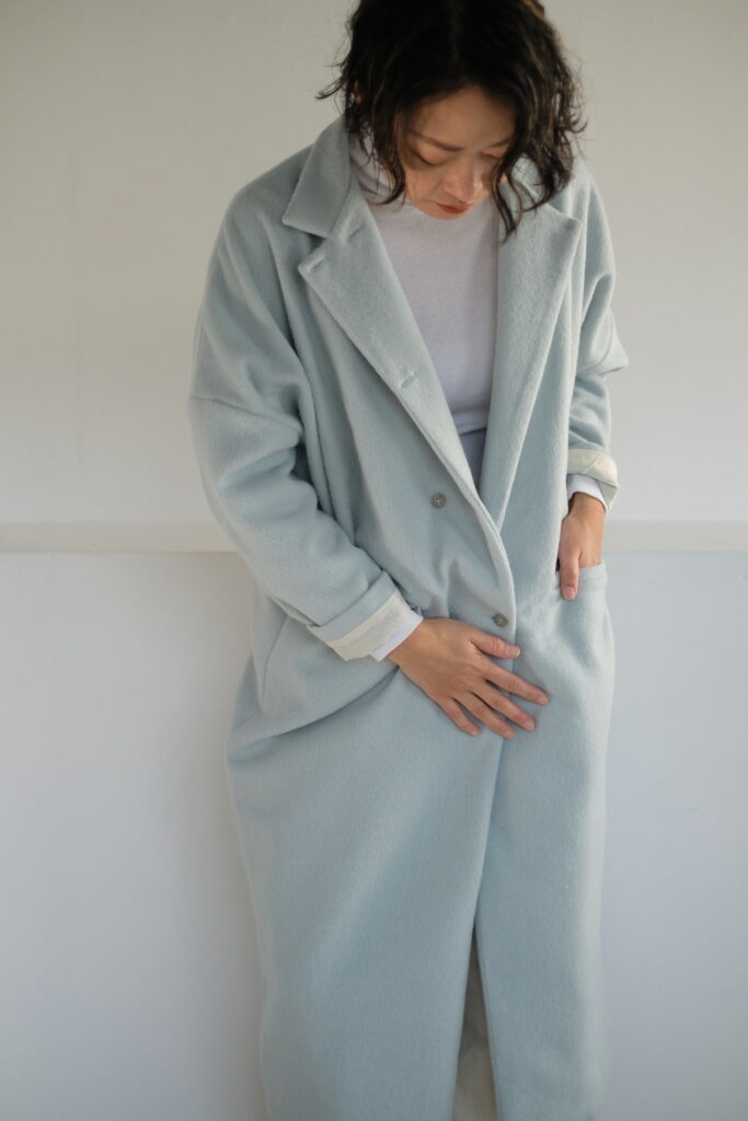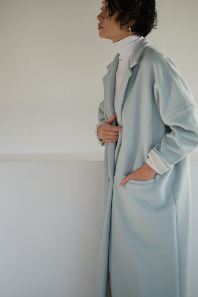 Long w jacket coat〈 mizuiro 〉 Long w jacket coat〈 mizuiro 〉__________________angora60 wool40 62000 (68200taxin)縦にウール100%の糸を、横にアンゴラ100%の糸を使用した上質素材です。表面にシャギーを施すことでアンゴラの上品な毛足が表面に出てくるため艶感にすぐれ柔らかい印象です。非常に軽い素材感のためロングコートでも重さを感じません。 着丈 117cmmail order
